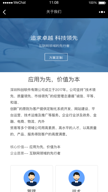 科创软件团队组建于2012年3月,2017年9月公司成立公司 “深圳科创软件有限公司”。公司主要为用户提供高端网站定制、微信定制、APP定制、区块链应用、智能支付等服务项目。公司自研产品科创UI+能无缝兼容市面上所有小程序运行平台。